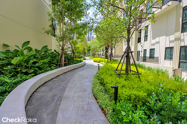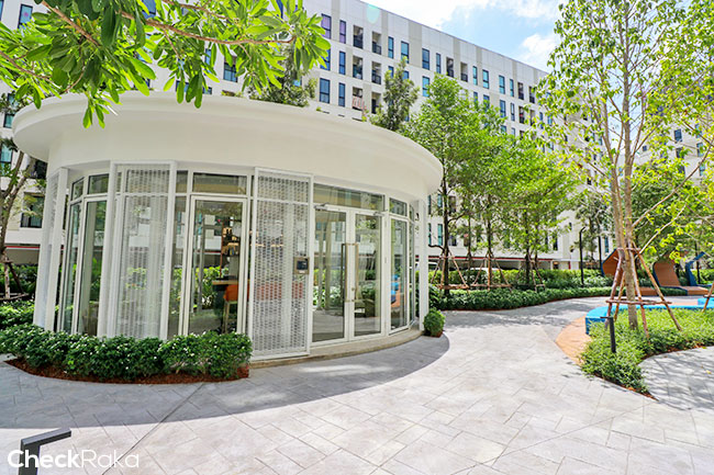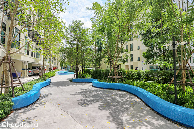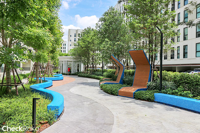 เดินไปพื้นที่ส่วนกลาง ดู Facilities ที่ทางโครงการจัดให้กันค่ะ บรรยากาศระหว่างตึกจะรายล้อมไปด้วยพื้นที่สีเขียว