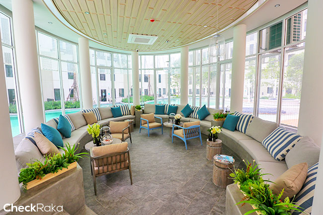 พื้นที่ Common Room ใน Sunken Pavilion ค่ะ จัดเต็มพื้นที่นั่งพักผ่อน พร้อมเทควิวสระว่ายน้ำได้เต็มๆ เลย
