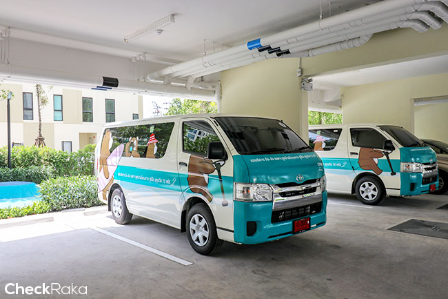 แอบเห็นรถ Shuttle รับ-ส่ง ไปสถานีรถไฟฟ้า BTS ของโครงการพอดีค่ะ สีสันน่ารักเชียว