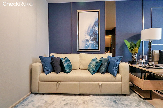ขวามือวางโซฟาขนาด 2 ที่นั่งได้ ส่วนซ้ายมือทางโครงการ Built-in ชั้นวางทีวีมาให้เรียบร้อยค่ะ