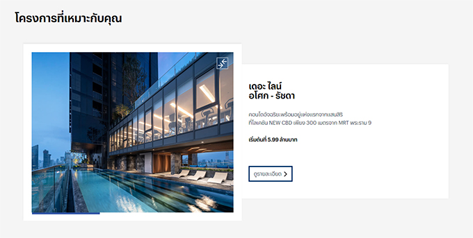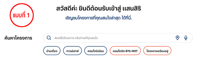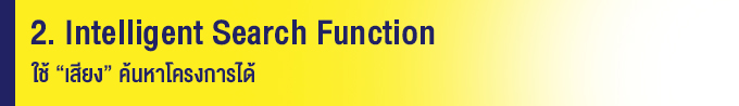 สามารถค้นหาโครงการที่ต้องการได้ง่ายๆ ไม่ว่าจะเป็นการกดไปที่คำค้นหาเบื้องต้นที่เว็บไซต์ได้ Set ไว้ให้ หรือจะเป็นการพิมพ์ชื่อโครงการ ทำเล หรือข้อมูลอื่นๆ ที่เกี่ยวข้อง และที่โดดเด่นเลยก็คือสามารถค้นหาด้วยคำสั่งเสียงก็จะพบผลการค้นหาที่ต้องการทันที