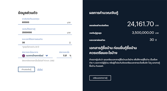 หนึ่งในขั้นตอนที่สำคัญของการซื้อที่อยู่อาศัยก็คือขั้นตอนการขอสินเชื่อ (สำหรับคนที่ไม่ได้ซื้อเงินสด) บางคนอาจจะไม่แน่ใจว่าเงินเดือนเท่านี้จะสามารถกู้ได้เท่าไหร่ ดังนั้นแสนสิริจึงให้ความสำคัญกับปัญหานี้ ได้ออกแบบโปรแกรมวางแผนเลือกสินเชื่อที่เหมาะสมกับตัวคุณด้วยฟังก์ชันเครื่องคำนวณเงินกู้ที่อ้างอิงอัตราดอกเบี้ยจากธนาคารชั้นนำ อาทิ ธนาคารไทยพาณิชย์ ธนาคารกสิกรไทย ธนาคารยูโอบี เป็นต้น แต่อย่าลืมนะคะ ว่าผลการประเมินจากเครื่องคำนวณสินเชื่อเป็นเพียงการประเมินวงเงินกู้ในเบื้องต้นเท่านั้น ส่วนการอนุมัติสินเชื่อสงวนสิทธิ์เป็นไปตามหลักเกณฑ์ของธนาคาร