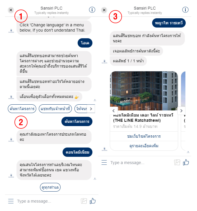 โปรแกรมแชทนี้ทำให้เราได้ใกล้ชิดกับแสนสิริมากขึ้น หลังจากที่ลองแชทแล้วขอบอกเลยว่าได้คำตอบที่รวดเร็ว ตรงตามความต้องการมากๆ โปรแกรมสามารถตอบทุกคำถามที่ทุกคนสงสัยด้วยฟังก์ชัน Chatbot ตลอด 24 ชั่วโมง หรือ Chat กับเจ้าหน้าที่ได้ในเวลาทำการ