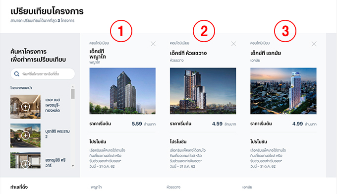 วิธีกดเปรียบเทียบ คือกดที่สัญลักษณ์ลูกศร 2 อัน สามารถเลือกได้สูงสุด 3 โครงการ