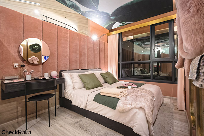มาต่อที่ห้องนอนค่ะ วางเตียงควีนไซส์แล้วยังเหลือพื้นที่รอบๆ อีกเยอะ วางโต๊ะทำงานหรือโต๊ะเครื่องแป้งได้อีก