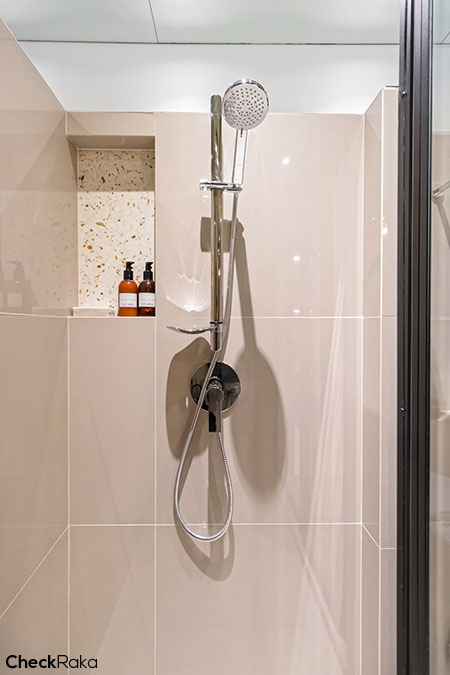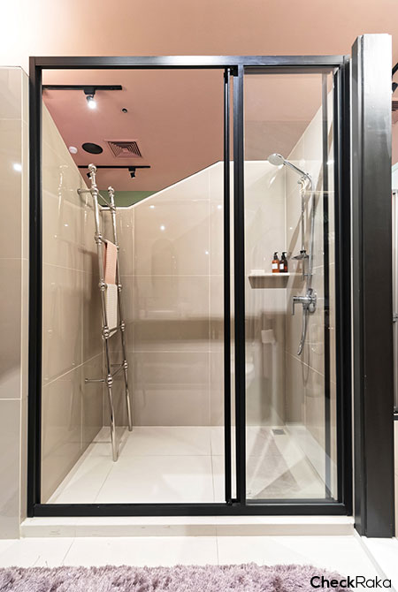 พื้นที่อาบน้ำพร้อมฉากกั้น 3 ตอน มีช่องวางสบู่เล็กๆ น่ารักมาให้ด้วย