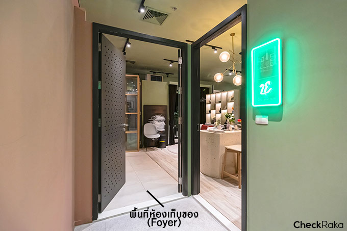 Layout ดีไซน์ใหม่ ที่เรายกประตูห้องเก็บของมาไว้ด้านนอก ส่วน Foyer นี้สามารถเอาไว้เก็บข้าวของได้ อย่างเช่น จักรยานบางคนไม่อยากเข็นจักรยานเข้าไปในห้องเพราะกลัวเลอะ พื้นที่ Foyer นี่ล่ะค่ะตอบโจทย์คุณเลย