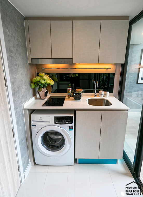 ห้องนี้ขายแบบ Fully Fitted ได้ชุดครัว (เคาน์เตอร์ครัว เตาไฟฟ้า เครื่องดูดควัน อ่างล้างจาน ของ MEX) Furniture ของ Index Living Mall ชุดสุขภัณฑ์ Mogen และแอร์ 2 ตัว ของ Daikin