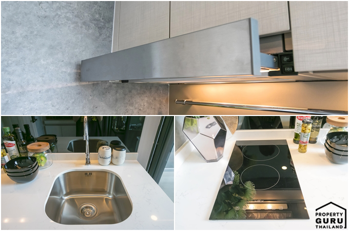 ทางโครงการให้ชุดครัวจะมีเคาน์เตอร์ รวมถึงชั้นวางของด้านบน ได้เตาไฟฟ้า 2 หัว ก๊อกน้ำหัวโค้ง