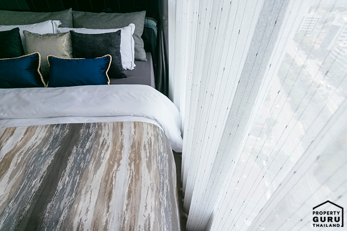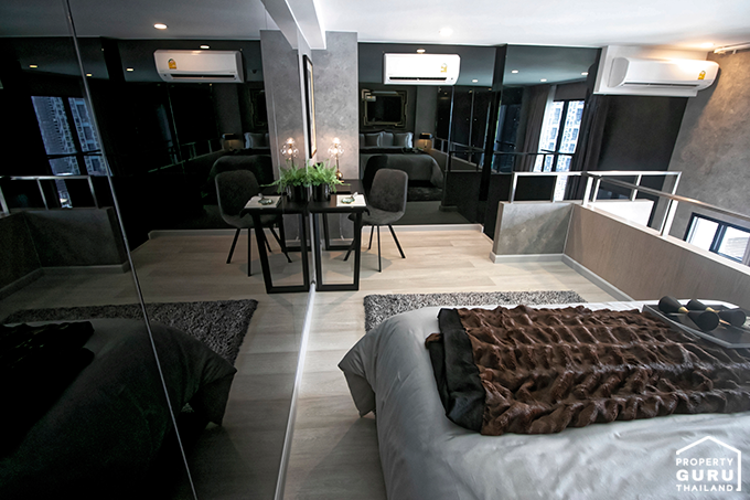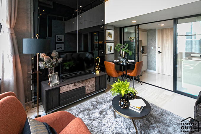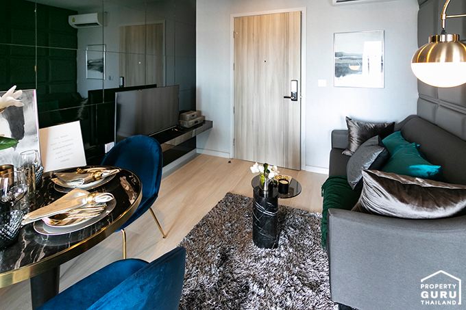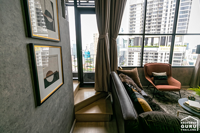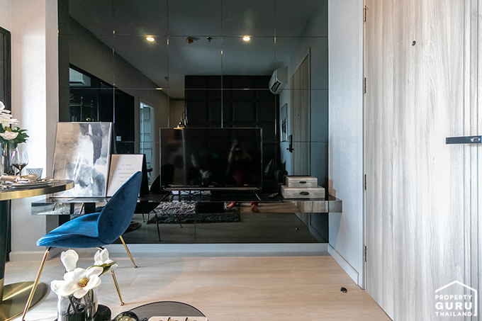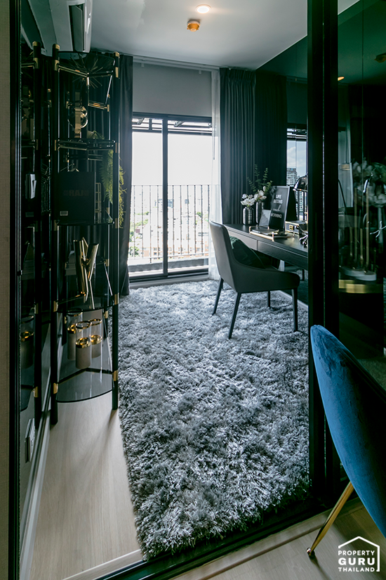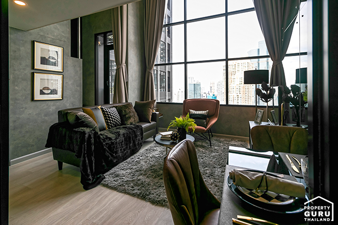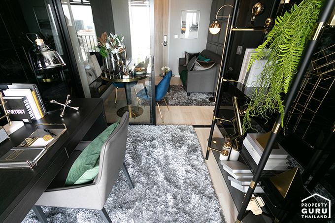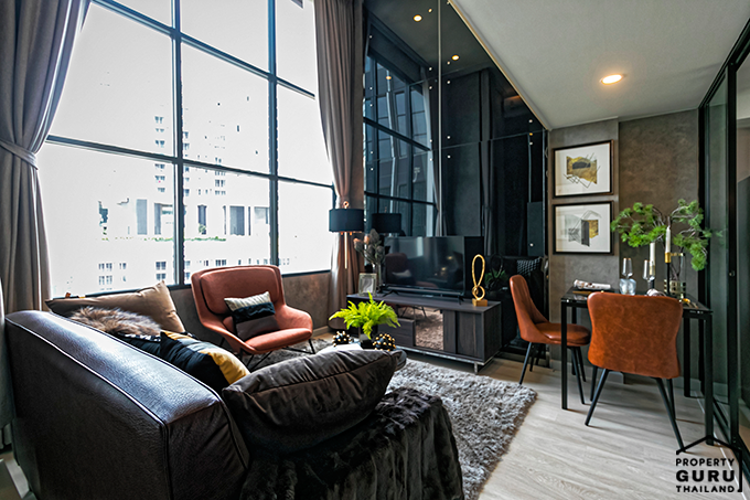 เนื่องจากได้เพดานที่สูงแล้ว ยังมีกระจกบานใหญ่ ทำให้พื้นที่ส่วนนี้ดูโล่ง โปร่ง และหากตกแต่งแบบห้องตัวอย่าง