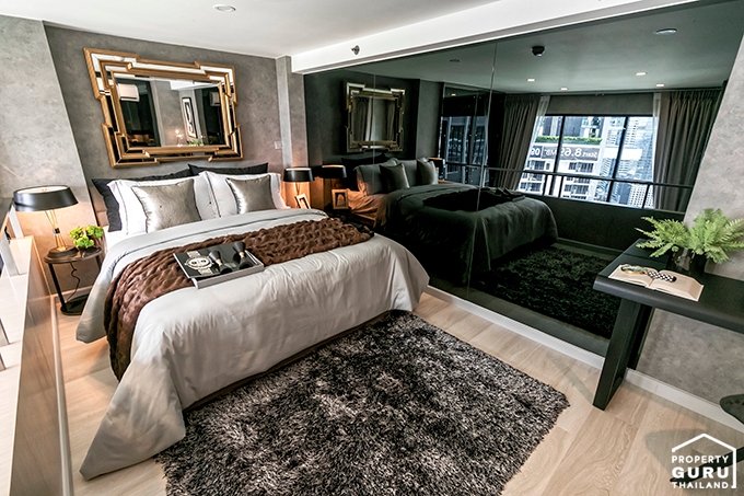 ห้องนอน มีกระจกบานใหญ่ และหน้าต่าง วางเตียงขนาด 5 ฟุตแล้ว เหลือพื้นที่ปลายเตียงพอเดินได้