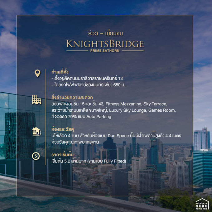 ไนท์บริดจ์ ไพร์ม สาทร (KnightsBridge Prime Sathorn) คอนโดหรูใจกลางเมือง ตั้งอยู่บนถนนนราธิวาสราชนครินทร์ ห่างจาก BTS สถานีช่องนนทรี (สายสีเขียว) เพียง 650 เมตร ตัวตึกสูง 43 ชั้น ออกแบบตัวอาคารเป็นรูปตัว Z ซึ่งมีข้อดีคือ วิวจากห้องพักจะไม่ถูกบังด้วยตึกที่อยู่ใกล้เคียง อีกทั้งตัวห้องแบบ Duo Space ที่มีฝ้าเพดานสูงถึง 4.4 เมตร พร้อมส่วนกลางขนาดใหญ่ และมีที่จอดรถแบบ Auto Parking อีกด้วย ปัจจุบันโครงการนี้สร้างเสร็จไป 97% แล้วค่ะ ดังนั้นวันนี้ เราจะพาไปชมบรรยากาศของห้องจริงบนตึกจริง ไปดูกันสิว่าสร้างเสร็จแล้วจะมีความสวยงาม และน่าสนใจขนาดไหน ตามไปชมกันเลย