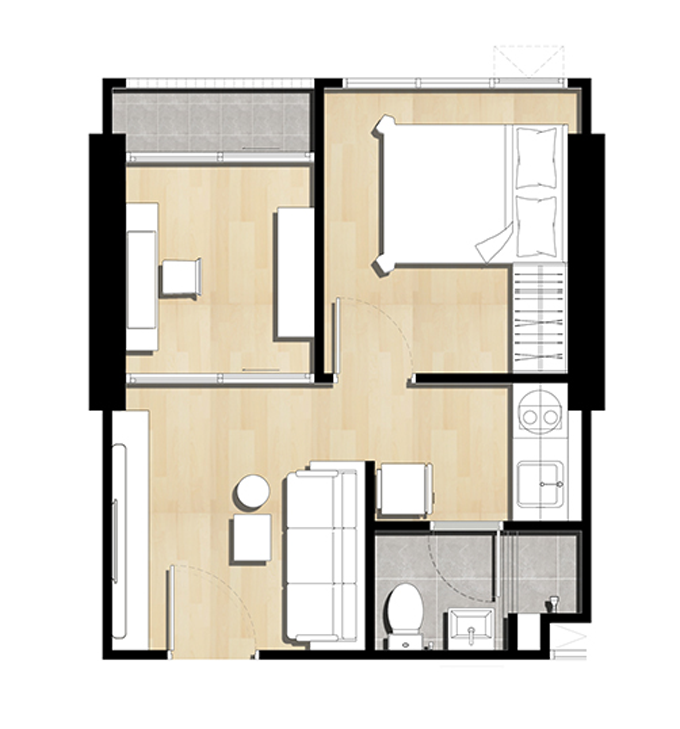 - Type B, Duo Space พื้นที่ 25.5 ตร.ม. พื้นที่รวม 37 ตร.ม. (1 Bedroom)