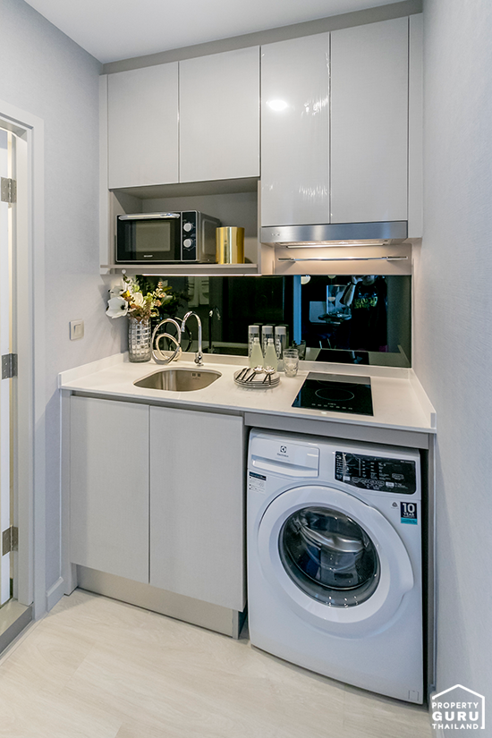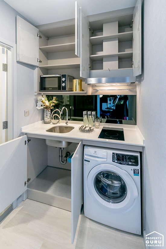 ทางโครงการให้ชุดครัวจะมีเคาน์เตอร์ รวมถึงชั้นวางของด้านบน
