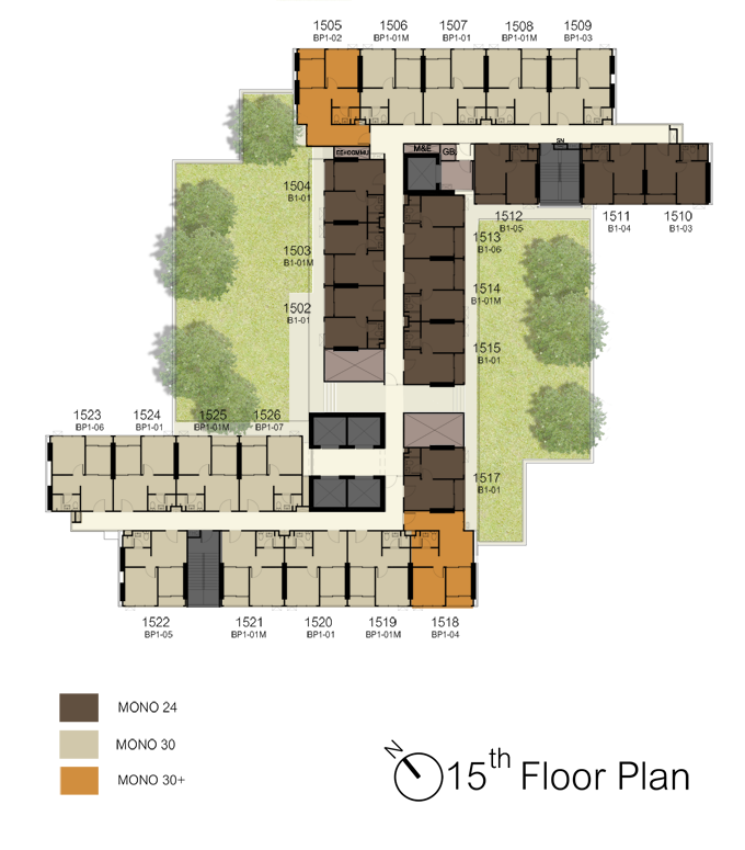 Floor Plan ชั้น 15 : เป็นชั้นที่มีทั้งสวนบางส่วนและห้องพักอาศัย