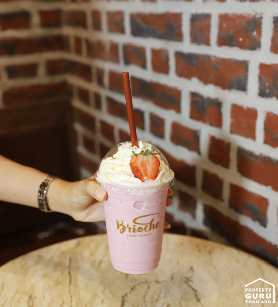 ส่วนเครื่องดื่ม สั่งเป็น Strawberry Frappe ซึ่งใช้สตรอว์เบอร์รีจริงๆ ลงไปปั่นด้วย