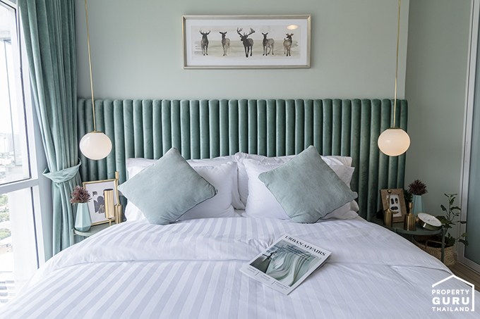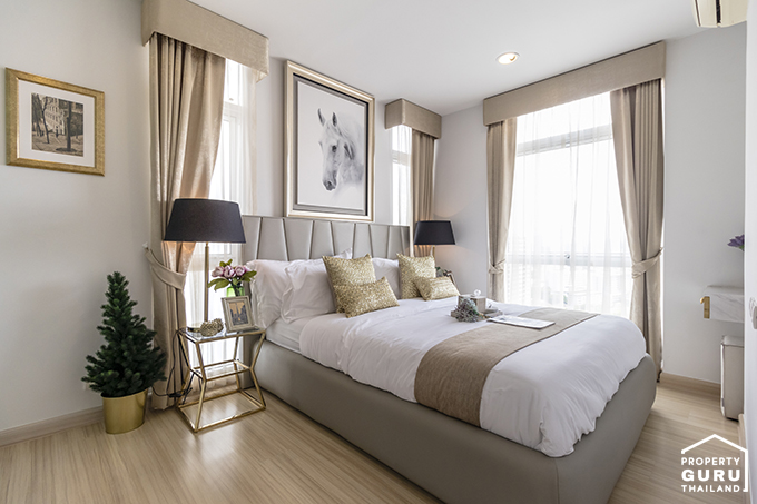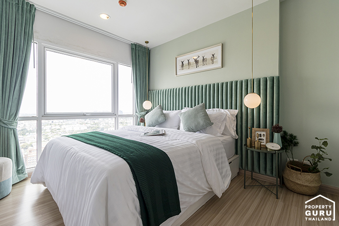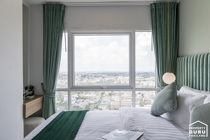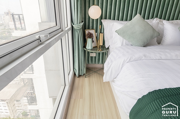 ภายในห้องนอนค่อนข้างกว้างและโปร่ง มีหน้าต่างรับแสง 2 จุดที่หัวเตียง และบานใหญ่ข้างเตียงอีก 1 จุด