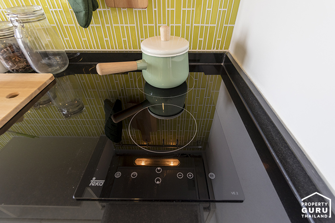 พื้นที่ครัวถ้าใครอยากทำเป็นครัวปิดก็สามารถทำได้โดยการติดตั้งประตูบานเลื่อนได้นะคะ