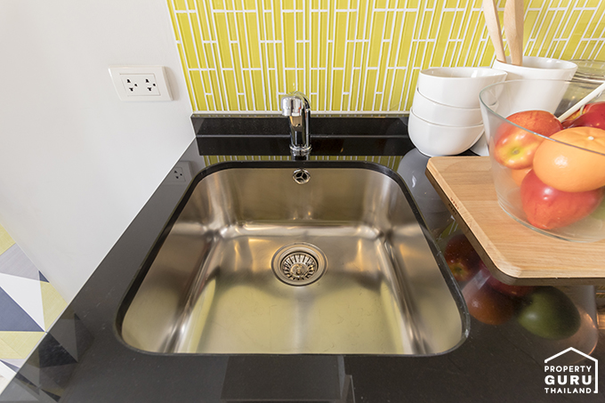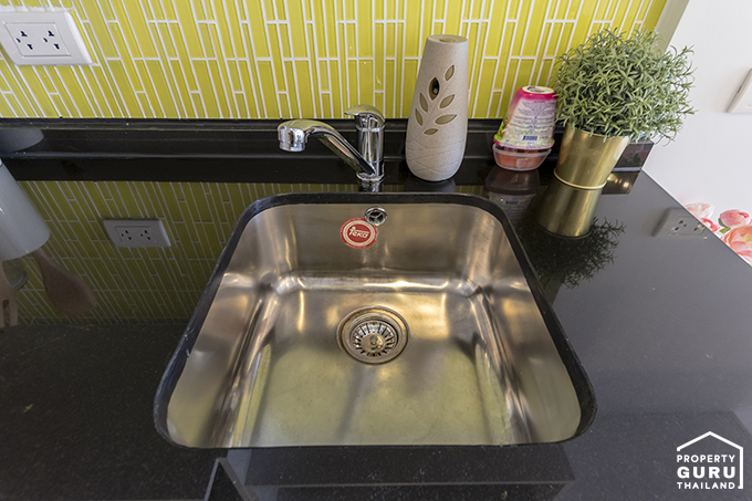 ข้างๆ อ่างล้างจานจะเป็นพื้นที่วางตู้เย็นค่ะ เลยมีปลั๊กไฟอยู่ตรงนั้น เวลาล้างอาจจะต้องระมัดระวังด้วย