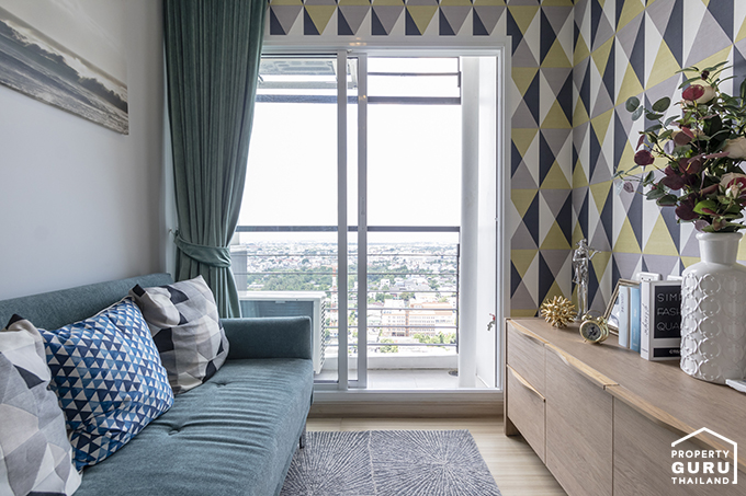 พื้นที่นั่งเล่นจะติดกับระเบียงถ้าไม่เปิดแอร์ก็สามารถเปิดประตูรับลมได้