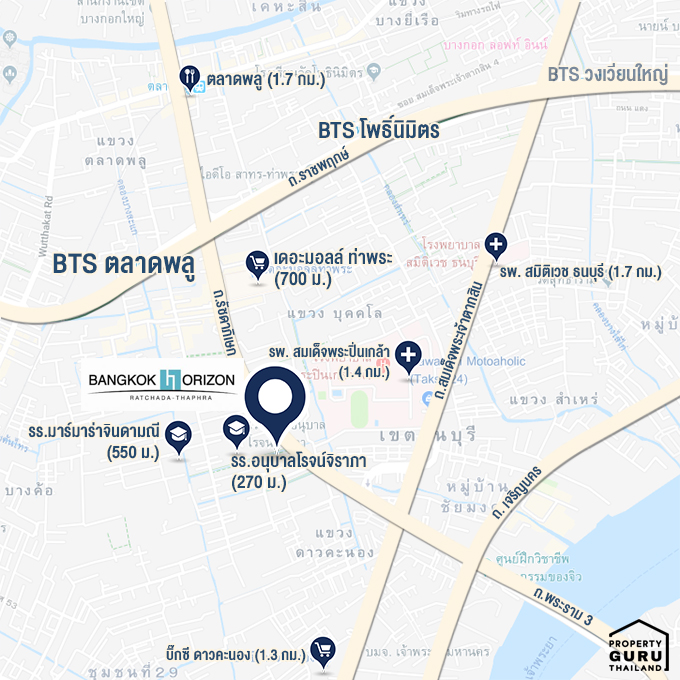 โครงการ แบงค์คอก ฮอไรซอน รัชดา-ท่าพระ (Bangkok Horizon Ratchada-Thaphra) อยู่ใกล้กับ BTS สถานีตลาดพลู ระยะเดินประมาณ 700 เมตรค่ะ และปัจจุบันสถานีบางหว้าที่ถัดจากสถานีตลาดพลูไป 2 สถานียังเป็น Interchange กับสายสีน้ำเงินช่วงหัวลำโพง-หลักสองอีกด้วย ระยะทางจาก BTS ถึงโครงการอาจจะเดินเหนื่อย แต่มีวินมอเตอร์ไซค์คอยให้บริการอยู่ค่ะถ้าใครไม่อยากเดิน