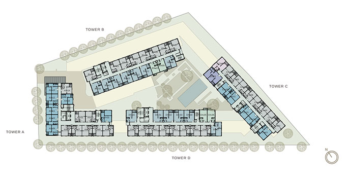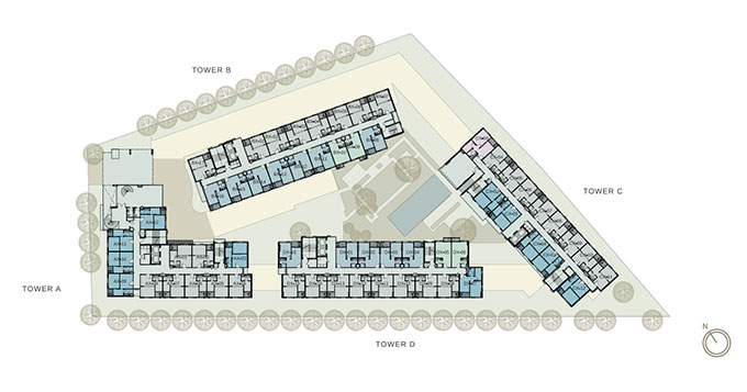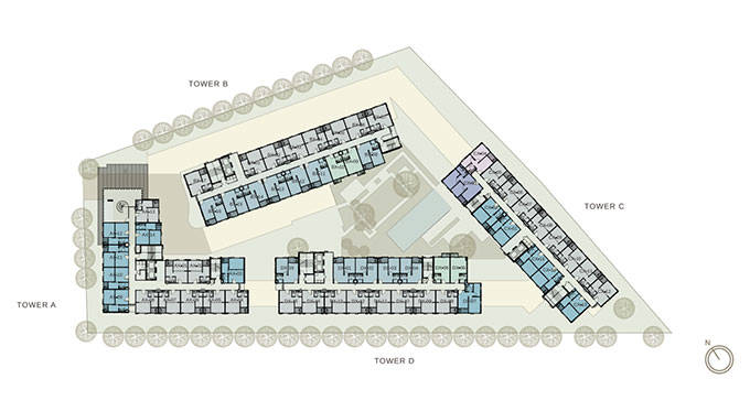 Ground Floor Plan ของโครงการ พื้นที่ส่วนกลางจะอยู่ตรงกลาง ล้อมรอบด้วยอาคารทั้ง 4
