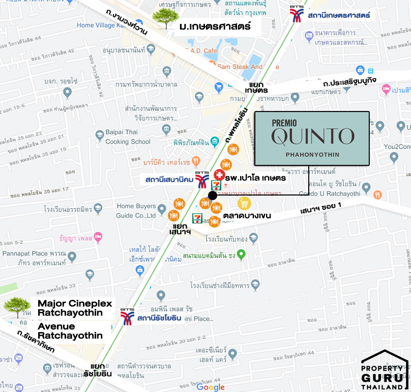 พรีมิโอ ควินโต (Premio Quinto) ตั้งอยู่ติดถนนพหลโยธิน ระหว่างซอยพหลโยธิน 32 และ 34 ห่างจากรถไฟฟ้าสายสีเขียวสถานีเสนานิคม เพียง 10 ม. (สถานีเสนานิคมจะเปิดใช้ปลายปี 2562 นี้)