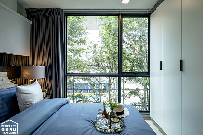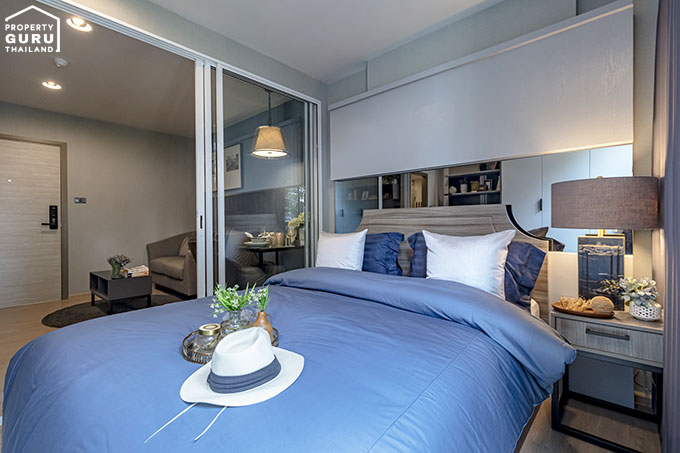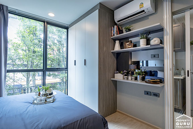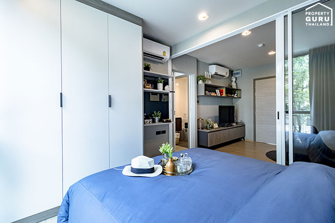 ระยะห่างปลายเตียงมีพื้นที่ให้ยืนแต่งตัวได้ ทางโครงการ Built-in ตู้เสื้อผ้ามาให้ค่ะ