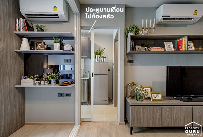 ระยะห่างดูทีวี ไม่ไกลจนเกินไป ทางโครงการ Built-in ชั้นวางทีวี และชั้นวางของมาให้ค่ะ