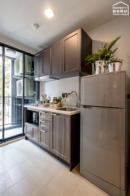 ห้องครัวจะปูด้วยกระเบื้องค่ะ ซึ่งง่ายต่อการทำความสะอาดและดูแลรักษา โดยโครงการจะ Built-in