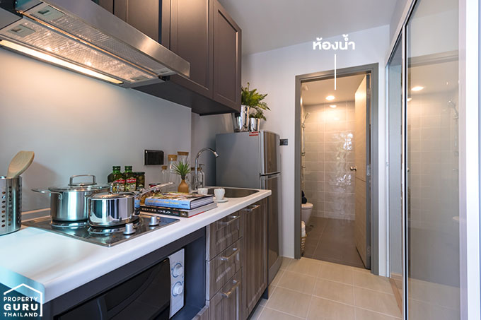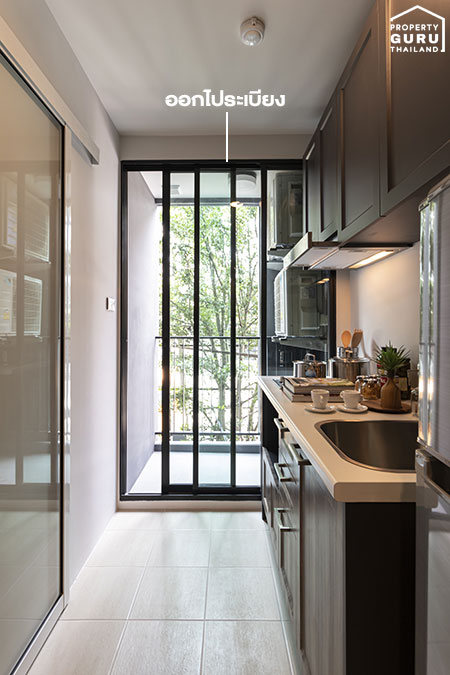 ไปดูห้องครัวกันค่ะ ซึ่งประตูห้องครัวจะเป็นประตูบานเลื่อนอะลูมิเนียม กระจกใสเช่นกัน