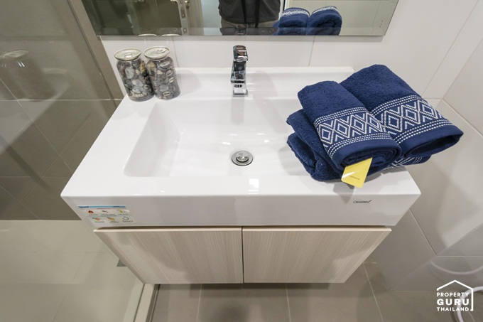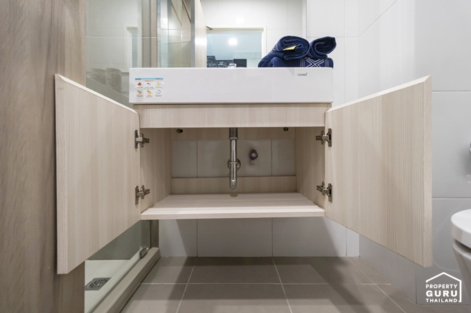 ใต้อ่างออกแบบเป็นตู้สำหรับเก็บของ บานพับแบบ Soft Close