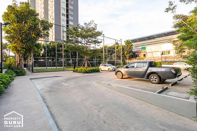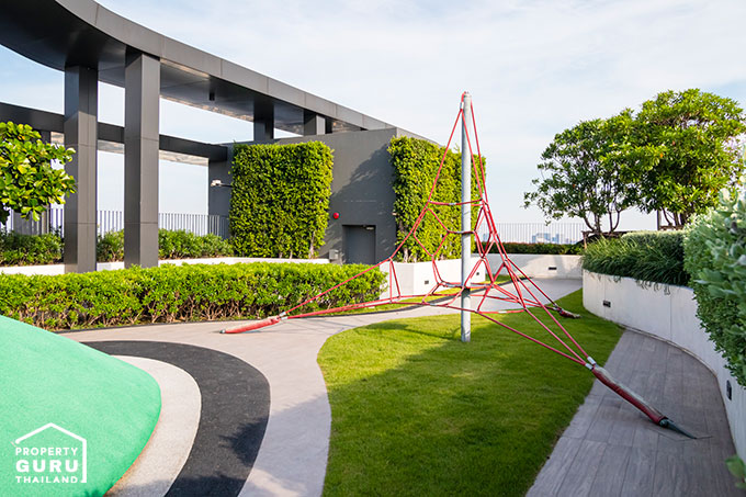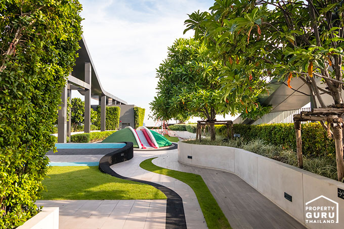 กลับมาที่บริเวณพื้นที่สีเขียวด้านหน้าอาคารจอดรถ สามารถวิ่งเล่นเดินเล่นได้