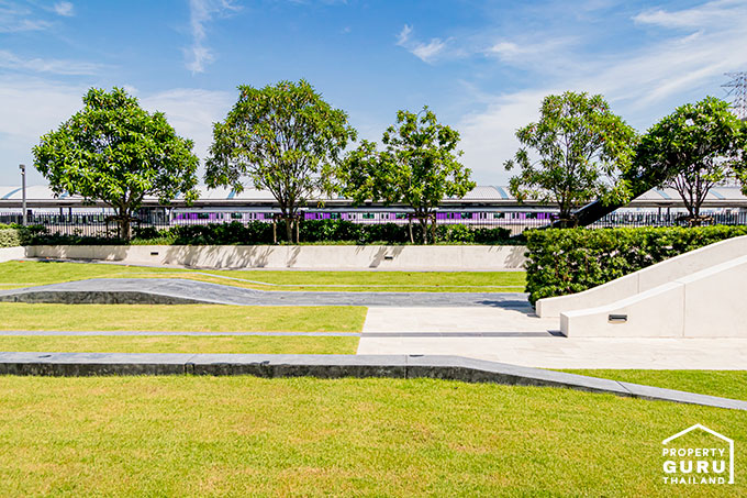 ลานกว้างๆ พื้นที่สนามหญ้าสีเขียว มองเห็น MRT สถานีวงศ์สว่าง