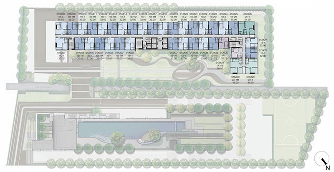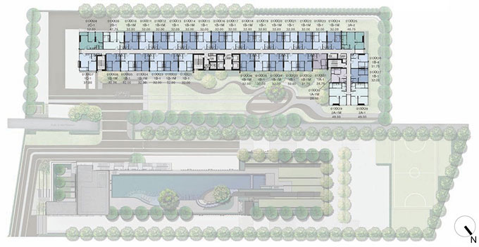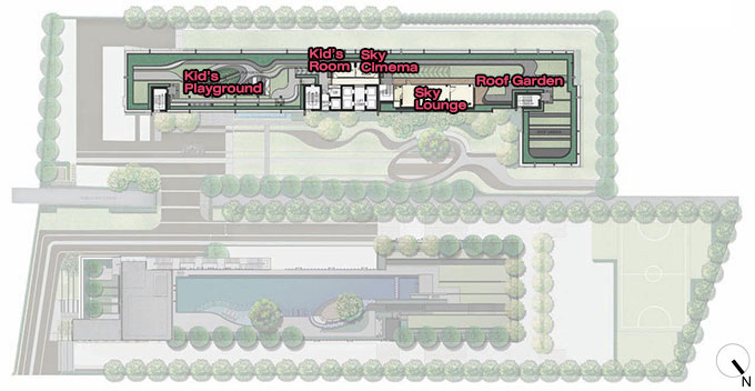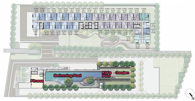 Floor Plan ชั้น 9 ประกอบไปด้วย สระว่ายน้ำ, ฟิตเนส และพื้นที่สีเขียว