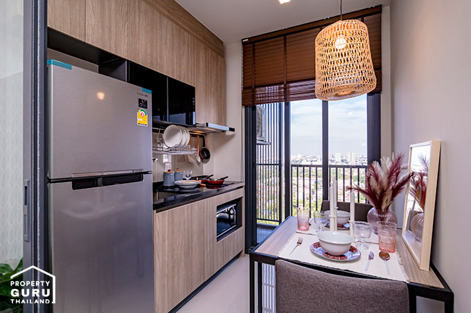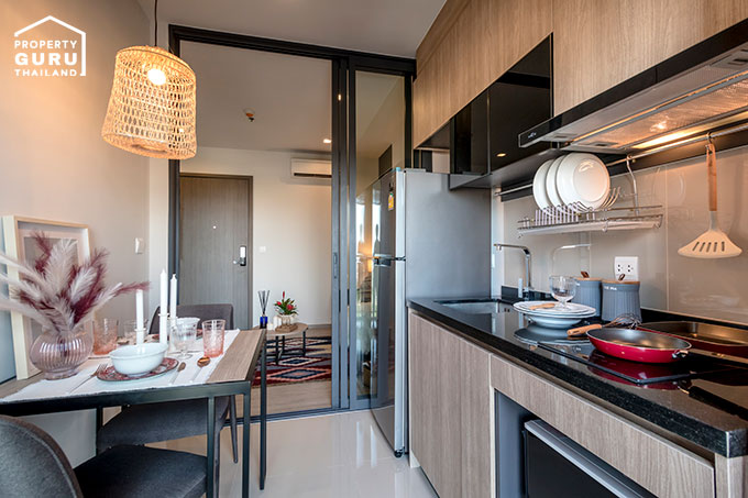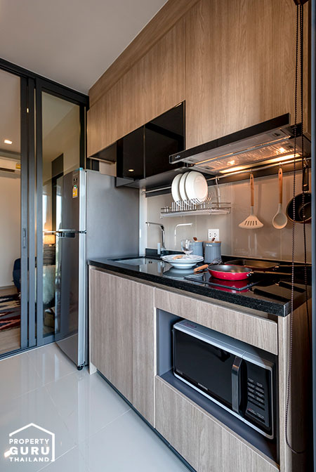 พื้นที่ห้องครัวจะเป็นพื้นกระเบื้อง เฟอร์นิเจอร์ก็ได้ตามนี้เลย พร้อม Hob&Hood, ตู้เย็น และไมโครเวฟ