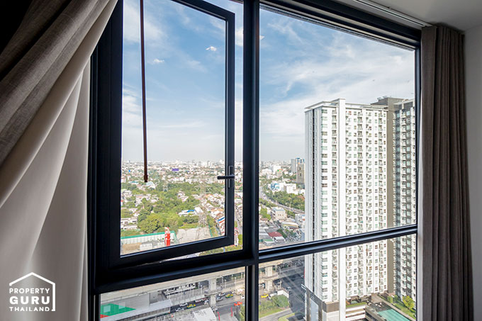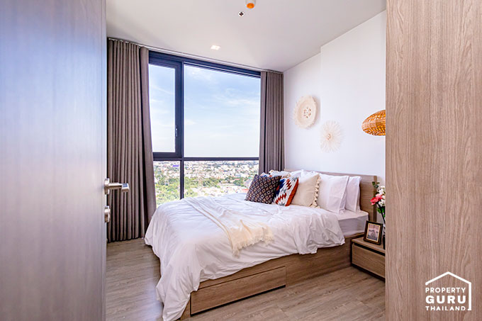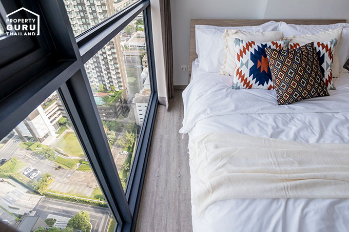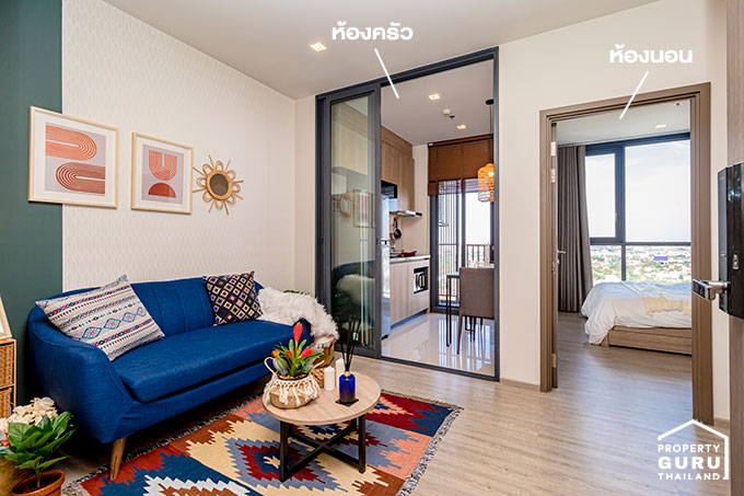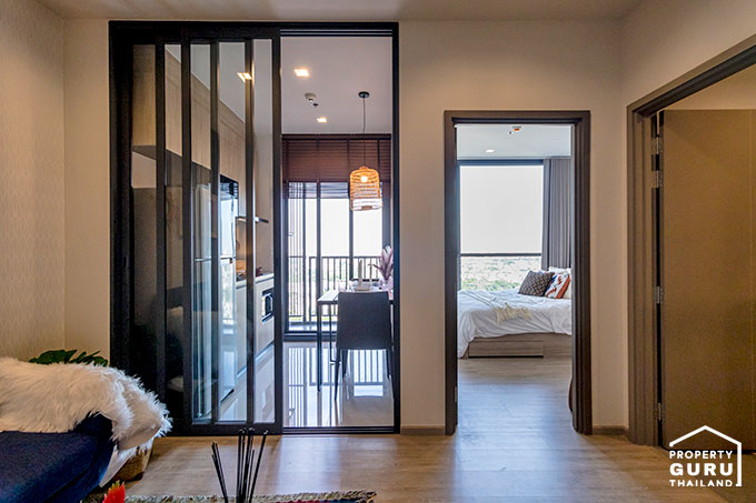 พื้นที่ใช้สอยแบ่งสัดส่วนกันชัดเจน พื้นห้องเป็นลามิเนต Floor To Ceiling 2.65 เมตร
