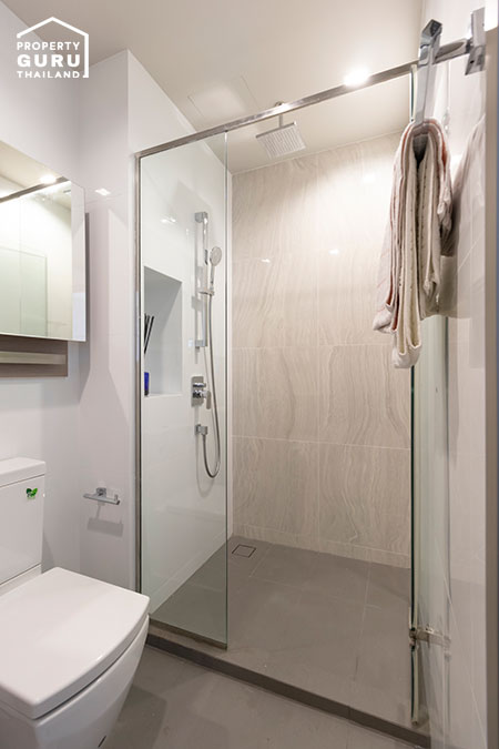 ภายในห้องน้ำจะได้สุขภัณฑ์และตู้เก็บของตามนี้เลย ส่วนอาบน้ำก็ติดตั้งฉากกั้นมาให้เช่นกัน