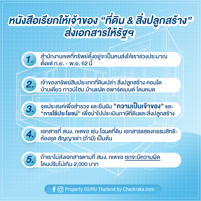 ภาษีที่ดินจะเริ่มใช้บังคับกับเจ้าของที่ดิน คอนโด และสิ่งปลูกสร้างตั้งแต่วันที่ 1 มกราคม 2563 นี้ ซึ่งแต่ละคนจะต้องเสียเท่าไหร่บ้างนั้น ทาง Checkraka.com เราเคยทำสรุปให้ดูแล้วตามบทความนี้ครับ ต้องเสียภาษียังไง ถ้าถือคอนโดอยู่หลายห้อง หรือมีทั้งบ้านทั้งคอนโด? และเมื่อเร็วๆ นี้ หลายคนคงได้รับจดหมายเรื่อง "ขอเอกสารหรือหลักฐานแสดงความเป็นเจ้าของกรรมสิทธิ์ในสิ่งปลูกสร้าง" พร้อมกับแบบฟอร์มให้กรอกเพื่อสำรวจที่ดินและสิ่งปลูกสร้างจากสำนักงานเขตต่างๆ ที่คอนโดแต่ละแห่งตั้งอยู่ คำถาม คือ ถ้าเราได้รับแล้ว เราควรต้องทำอย่างไรบ้าง? วันนี้ทาง Checkraka.com มีคำแนะนำมาเล่าให้ฟังกันครับ