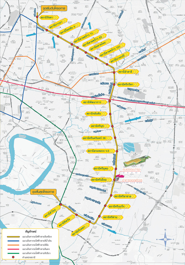 แผนผังเส้นทางและสถานีทั้งหมดของรถไฟฟ้าสายสีเหลือง (ลาดพร้าว-สำโรง)