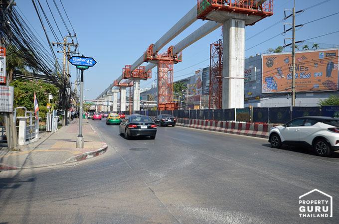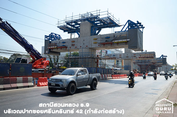 รถไฟฟ้าสายสีเหลือง (ลาดพร้าว-สำโรง) กำลังก่อสร้าง โดย "สถานีสวนหลวง ร.9" จะอยู่ปากซอยศรีนครินทร์ 42 เลย