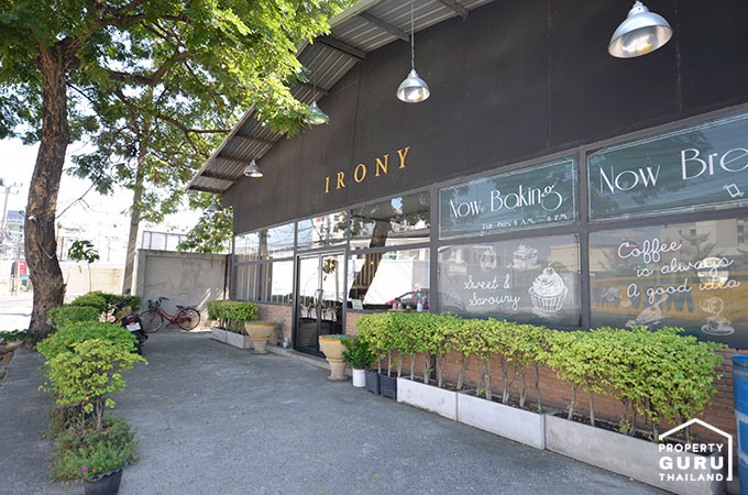 กลับมาปากซอยสุภาพงษ์แยก 1 อีกครั้ง เดี๋ยวเราเดินตรงเพื่อไป Sales Office กันค่ะ ปากซอยมีคาเฟ่ชื่อ IRONY ด้วยค่ะ