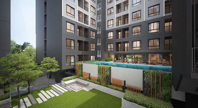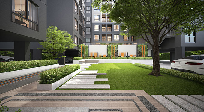 ภาพจำลองพื้นที่สีเขียวตั้งอยู่กึ่งกลางระหว่างอาคาร A และ อาคาร B