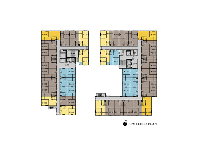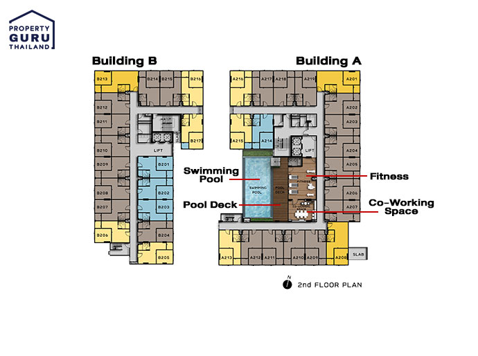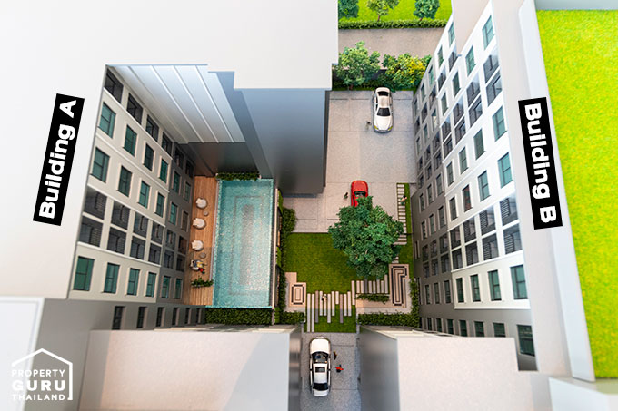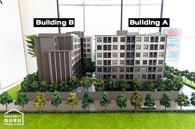 ซ้ายมือคือ อาคาร A ขวามือคือ อาคาร B พื้นที่ส่วนกลางทั้งหมดจะอยู่ที่ชั้น 2 ของอาคาร A
