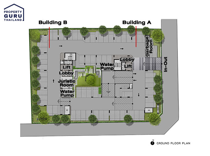 Master Plan ชั้น Ground : เป็นส่วนของ Drop Off, ที่จอดรถ และ Lobby ของแต่ละอาคาร