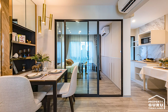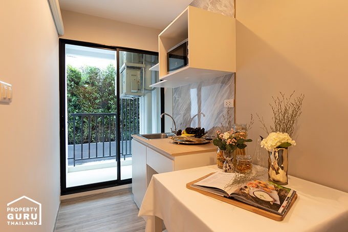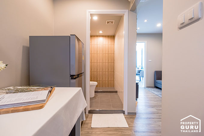 โดยห้องตัวอย่างที่เราจะพาไปชมวันนี้เป็นขนาด 28 ตร.ม. ค่ะ ขายแบบ Fully Fitted ได้เฟอร์นิเจอร์บางส่วน เช่น ชุดครัว Built-in พร้อมตู้เก็บของ และสุขภัณฑ์ภายในห้องน้ำ ไปชมห้องตัวอย่างพร้อมๆ กันค่ะ