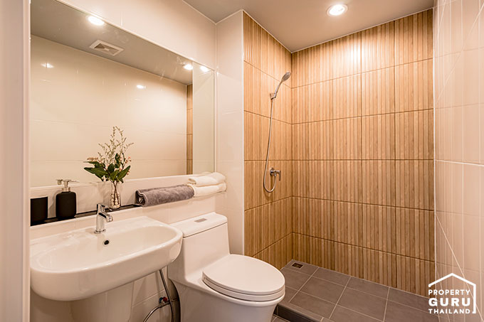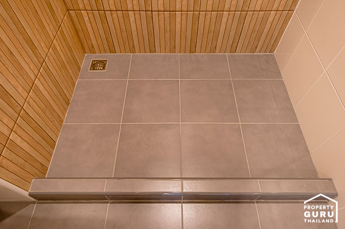 ห้องน้ำปูด้วยกระเบื้องสีเทา ส่วนผนังเป็นกระเบื้องสีครีมและกระเบื้องลายไม้ สุขภันฑ์ทั้งหมดจาก HAFELE