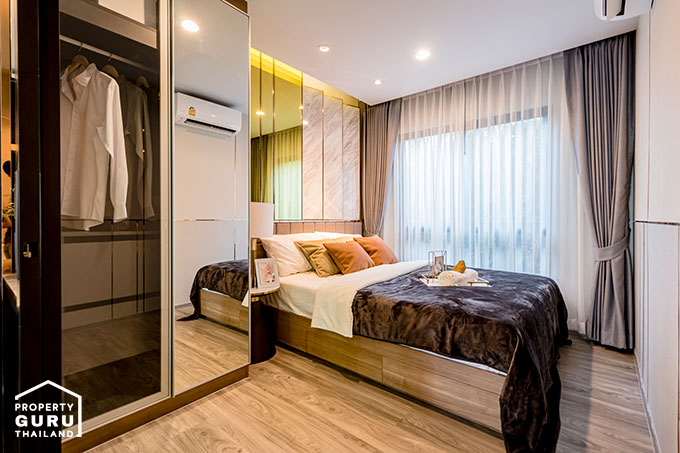 เหลือพื้นที่ให้ยืนแต่งตัวค่อนข้างเยอะค่ะ ปลายเตียงยังสามารถติดทีวีแขวนผนังหรือ Built-in ชั้นวางของเล็กๆ ก็ได้