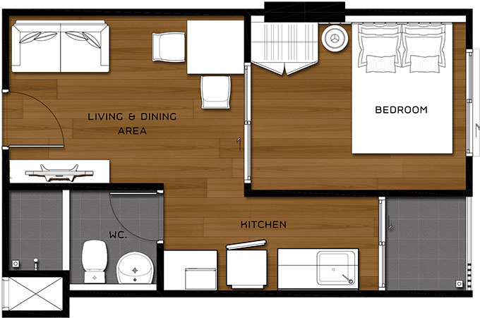 - 1 Bedroom 28 ตร.ม. (คลิกดูแปลนห้อง)