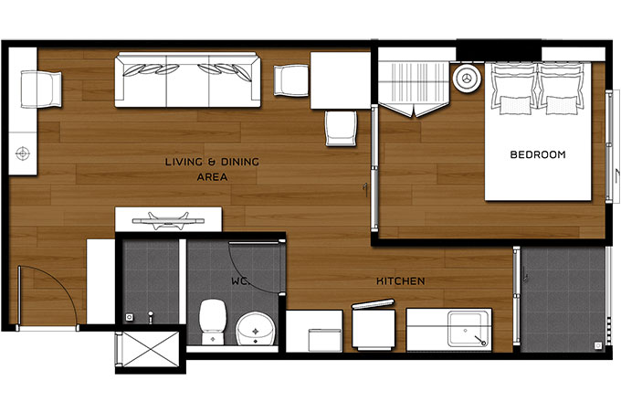 - 1 Bedroom 28 ตร.ม. (คลิกดูแปลนห้อง)